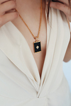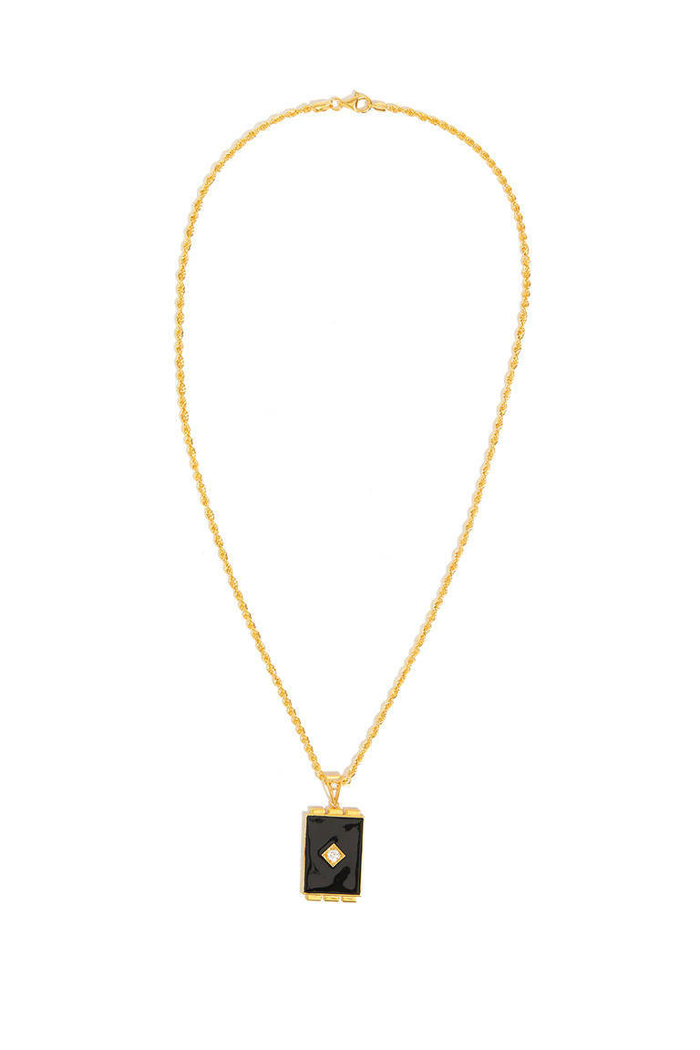 Gümüş üzeri altın kaplama, siyah mine, beyaz taşlı.